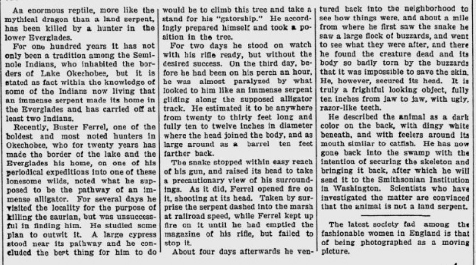 Everglades Florida Monster Slain in the Everglades Date: January 26, 2020Author: Karen Yvonne Hamilton 0 Comments FLORIDA MONSTER SLAIN IN THE EVERGLADESClinton Morning Age, Clinton, Iowa. Sunday, January 5, 1902 Share this: Click to share on X (Opens in new window) X Click to share on Facebook (Opens in new window) Facebook Click to share on LinkedIn (Opens in new window) LinkedIn Click to share on Reddit (Opens in new window) Reddit Click to share on Tumblr (Opens in new window) Tumblr Click to share on Pinterest (Opens in new window) Pinterest Click to print (Opens in new window) Print Click to share on WhatsApp (Opens in new window) WhatsApp Click to email a link to a friend (Opens in new window) Email Like Loading... Related