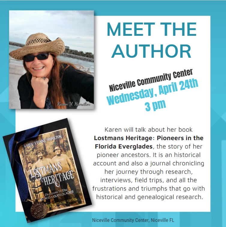 Karen Yvonne Hamilton is the author of Lostmans Heritage: Pioneers in the Florida Everglades, which was a silver medal winner in the Florida Authors and Publishers Presidential Awards in 2021 and 2nd place winner in the History category in the Bookfest Awards in 2023. In 2017 she was a finalist in the New Letters Award in Creative Nonfiction. Karen holds a BA in English, an M.Ed in Education, and has studied with some of the top universities in the MFA in Creative Writing programs. She has published essays with Heritage Press, Florida Living, and The Florida Genealogist. She was a weekly columnist for the St. Pauls Review and former assistant editor of The Florida Genealogist. Karen works as a consultant, helping other writers fine-hone their books for publication and as a consultant, helping families gather their stories through interviews and genealogical research. She is available for presentations in person and via Webinar. You can find her books and more information about her work at https://www.yesterdaypress.com/ You can contact Karen at kyvonnehamilton@gmail.com View all posts by Karen Yvonne Hamilton
