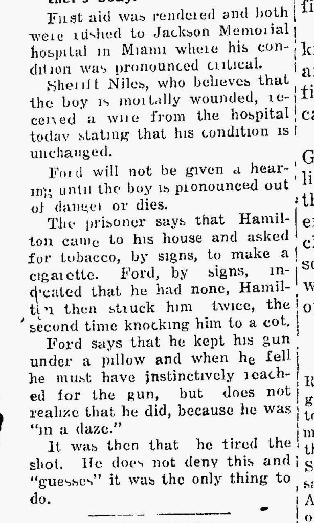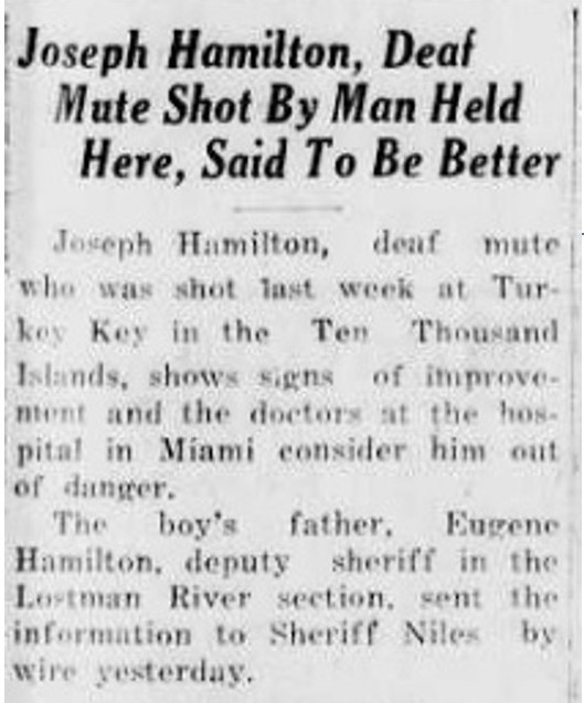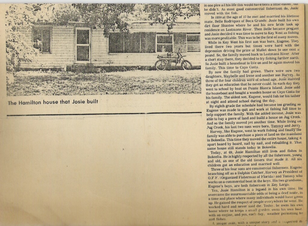 “ The Key West Citizen reported that “Young Hamilton (Josie) is well known to a number of Key West people having lived here for several months with his parents, who came here to attend a trial, following several attempts on the life of the father (King Gene). They stayed here until conditions became more settled in that section (Lostman River).”