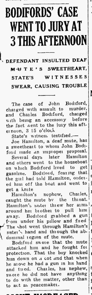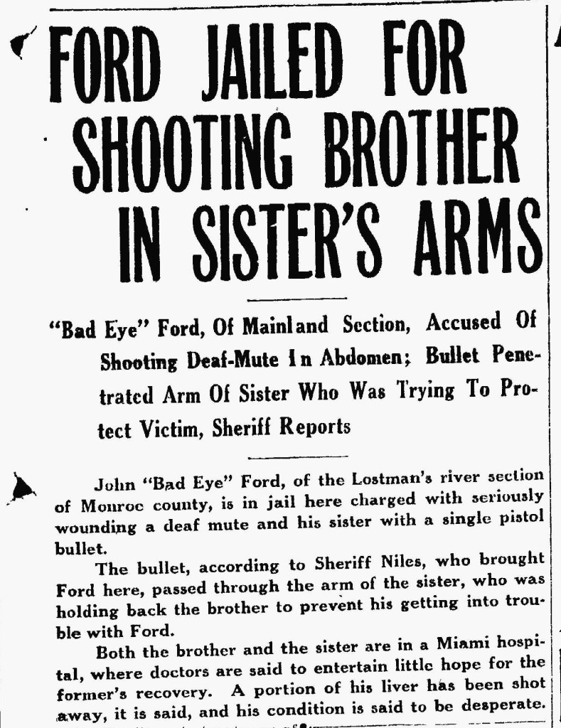 “On Turkey Key one night in August 1931, Josie Hamilton stopped by John Bodiford’s houseboat to ask if he had any gas. Now, Bodiford supposedly was sweet on Josie’s girl and had made some improper advances towards her. So, when Josie and his people showed up at his home, he figured Josie’s girl had told on him. He ordered Josie and the others off his boat. Then he went to get his knife. His nephew, Charles, fearing trouble, jumped Josie and the fight was on. John Bodiford appeared with a gun and fired a shot that struck Josie’s sister, Helen, in the hand. The bullet tore straight through her hand and buried itself in Josie’s belly. The trial, with John Bodiford charged with attempt to murder and Charles Bodiford charged as an accessory, went on throughout the fall.”