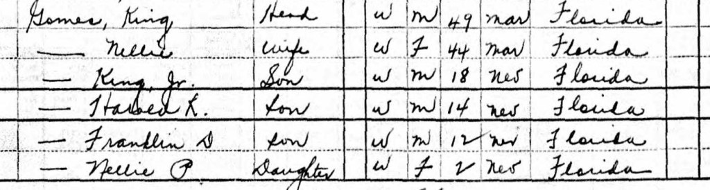 In 1950, Nellie and King were living in the Everglades with their children, King, Jr., Harold, Franklin, and Nellie. Charles WHIDDEN lived next door to the family.