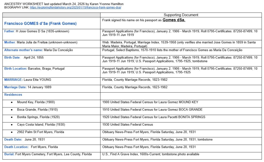 Francisco Gomes D’sa died on June 20, 1931, in Fort Myers, Florida, when he was 76 years old. He was laid to rest in the Fort Myers Cemetery, Fort Myers, Lee County, Florida.