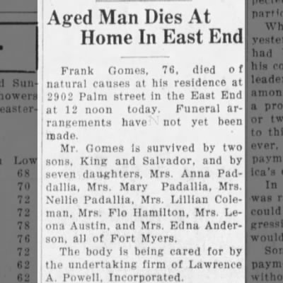 Francisco Gomes D’sa died on June 20, 1931, in Fort Myers, Florida, when he was 76 years old. He was laid to rest in the Fort Myers Cemetery, Fort Myers, Lee County, Florida.