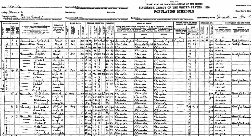 In 1930, Salvador lived with his wife and daughter at Poinciana Point. The Hamilton family lived nearby. He worked as a fisherman.