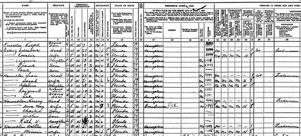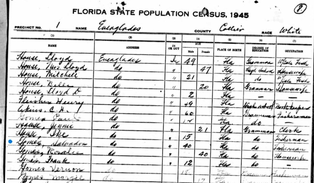 In 1940, Salvador lived with his wife and children on Lostmans River. The Hamilton family lived nearby. He worked as a fisherman.