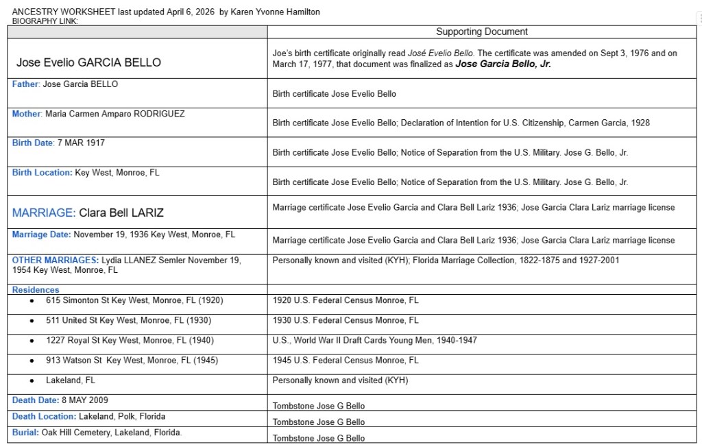 Jose Evelio (GARCIA) BELLO was born on March 7, 1917, in Key West, Florida, to Maria Carmen Amparo Rodriquez (1885-1959 b. Cuba) and Jose Garcia Bello (1871-1950 b. Cuba)