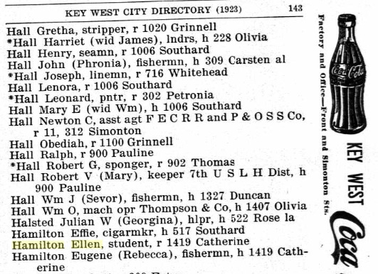 In 1923, the family had an address at 1419 Catherine St in Key West.