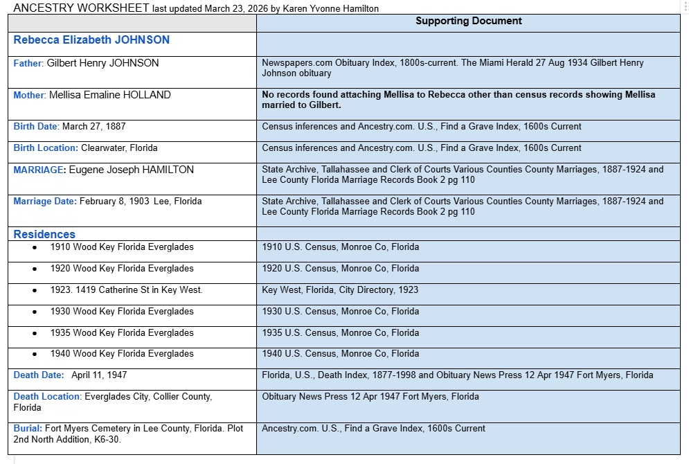Rebecca Elizabeth JOHNSON was born on March 27, 1887, in Clearwater, Florida, to Mellisa Emaline Holland (1862-1930 b. Georgia) and Gilbert Henry Johnson (1857-1934 b. Bahamas)