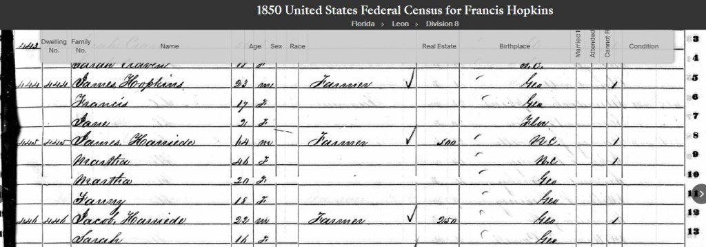 In 1850, James and Francis lived in Leon County, Florida with their daughter, Jane. Next door lived James and Martha Harriede and Jacob Harriede. James and Martha are possibly Francis’ parents?