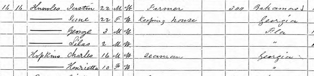In 1870, Justin and Jane Ann lived on Knockemdown Key. Living in their household were their two-year-old son, Silas, and Justin’s little brother, George, who was now 3 years old. Recall that Jane’s parents had died leaving several small children which Justin and Jane Ann were now raising, Charles was now 16 and Henrietta was 10.