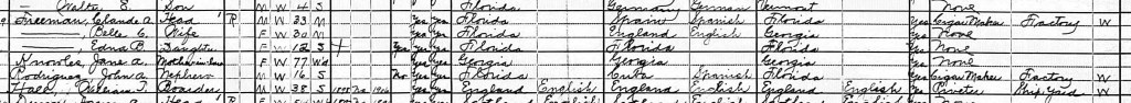 In 1920, Jane lived with her daughter, Bell Freeman at 515 West 10th Ave in Tampa, Florida. Also at the home were Edna (Bell and Claude’s daughter), John Canizares Rodriguez (Jane’s grandson and Bell’s nephew), and William J. Hall, a boarder. Claude and John worked as cigarmakers in a cigar factory. The boarder, Hall, worked as a riveter in the shipyard.