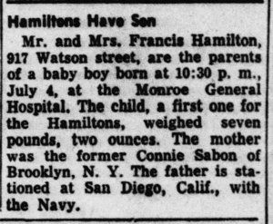 In 1951, Connie married Francis Salvador Theodore Hamilton in Key West. Their children were: