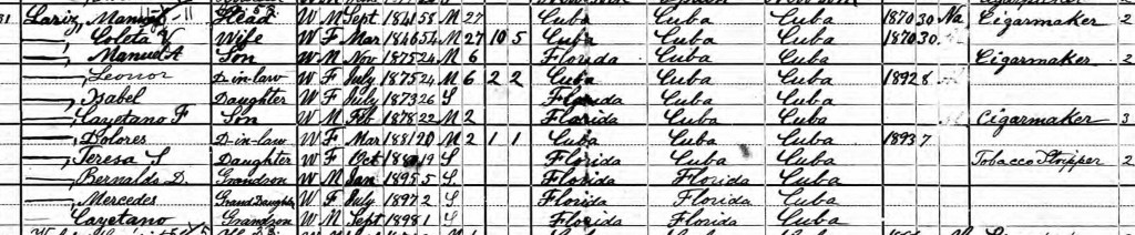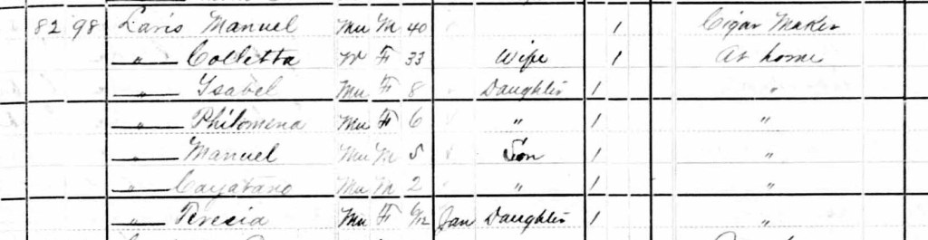 In 1900, the family lived at 510 Carolina St with Teresa added to the family. Also living with them were daughters-in-law, Leonora (Manuel’s wife) and Dolores (Cayetano’s wife), and grandchildren Bernaldo, Mercedes and Cayetano.