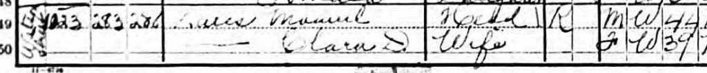 It is not known what became of Leonora (death or divorce?) but by August 5, 1914, Manuel married Clara Dena KNOWLES.