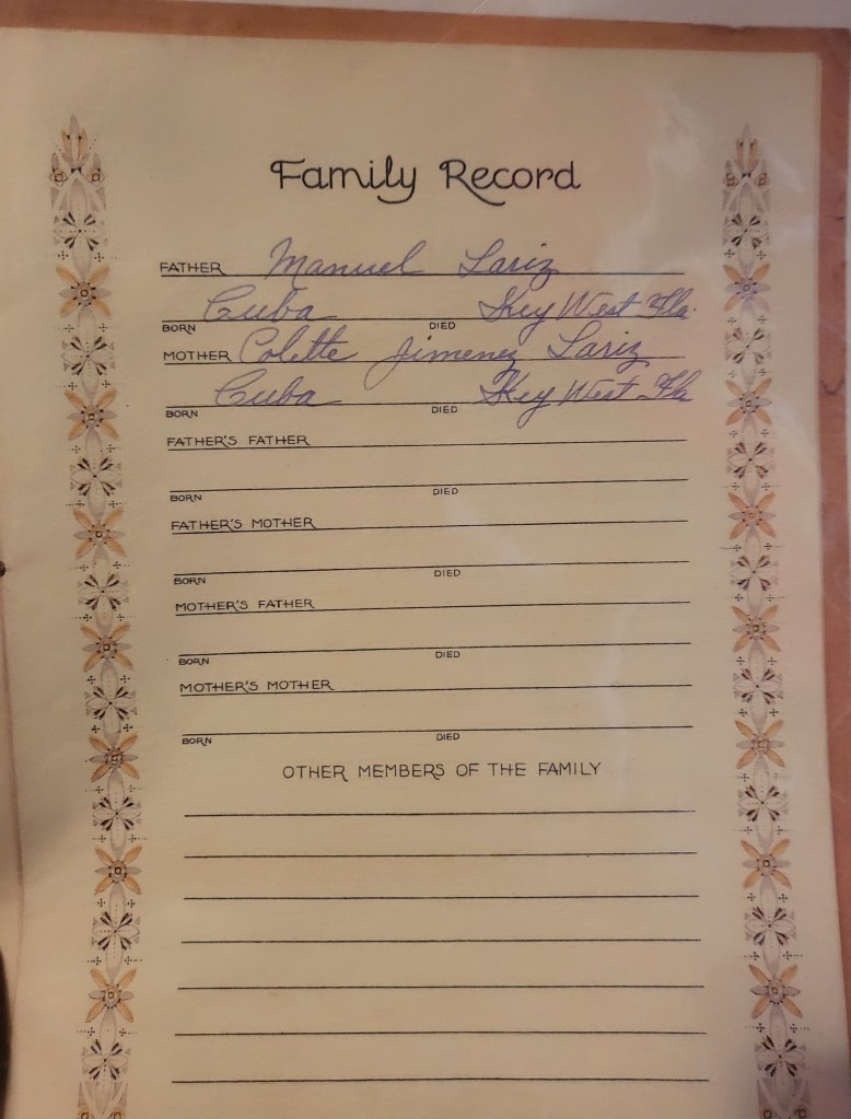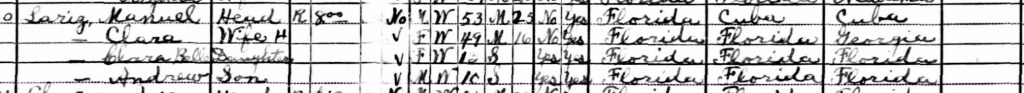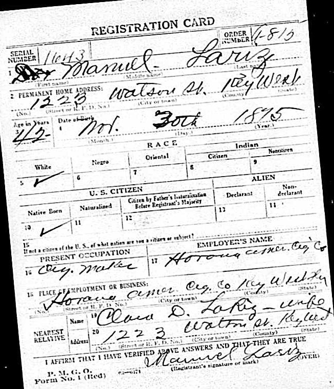 Manuel Andres LARIZ was born on November 30, 1875, in Key West, Florida, to Manuel Andre LARIZ (1841-1914) and Coleta JIMENEZ (1846-1922).