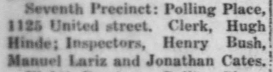 In 1934, Manuel served for the Board of County Commissioners in the November 6, 1934 General Election. He was assigned to the Seventh Precinct at 1125 United St as an Inspector alongside Clerk Hugh HINDE, Henry BUSH and Jonathan CATES.