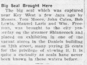 In 1906, Manuel helped to capture a seal near Key West, which was unusual as seals were not known to be in those waters. Tom MOORE, John CATES, Bob LEWIS, and William FREEMAN assisted in the capture. The seal was brought to one of the vacant stores in the Daniels building on 12th St by the steamer Shinnecock. It was placed on exhibition with people paying 25 cents to view it. (The Miami News 1906)
