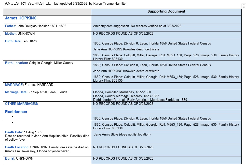 James HOPKINS married Frances Elizabeth HARRIEDE in Leon, Florida, on September 29, 1850, when he was 22 years old.