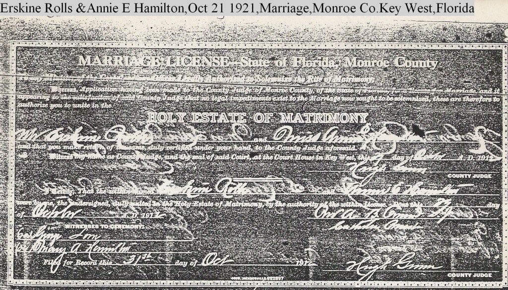 Annie married Erskine Rolle on October 21, 19__ in Key West, Florida. The marriage certificate is difficult to read. I believe the year is before 1918 since Ann is listed as Erskine’s nearest relative on his WWI draft card.