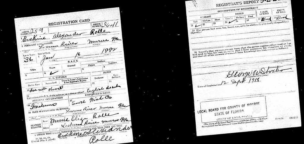 Erskine’s WWI draft card in 1918, lists “Annie Eliza Rolle” as his nearest relative. The couple lived at Lostmans River in the Everglades.