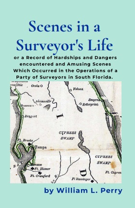 From William L. Perry, 1859: “The following pages contain a record of the dangerous and exciting, as well as amusing scenes encountered by a party of surveyors in South and East Florida, whilst engaged in the labor of laying out the public domain. When the heavens open and the rains descend, the settler enters his log-cabin, unpretending as it is, and he is secure from the beating storm. Under similar circumstances, the surveyor has no alternative but to lay his troubled head on a soft lightwood knot, his body on the wet ground, and let it rain, thanking his stars it isn’t a hailstorm instead of a rain. Such are some of the advantages of the frontier settler over the public land surveyor, briefly stated. I will not tax the time or patience of the reader in adducing others, but proceed at once to the object in view, which is simply to give an unvarnished historical account of a tramp of the writer and others in a survey of Government land in South Florida, and some of the many adventures connected with it. The kind reader, who patiently follows me through, will find recorded many hardships, and dangerous, exciting, as well as amusing scenes, which transpired while we were engaged in that work, and which I trust, may prove of interest to while away an hour of leisure.”