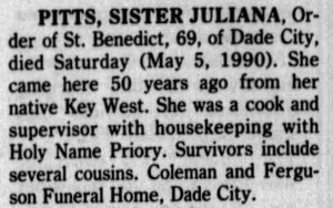 In 1940, Annie lived with other novices at the Holy Name Convent Motherhouse in St. Leo, San Antonio, Pasco County, Florida. The census lists her as having completed two years of high school in Key West. In 1940, Juliana entered Our Benedictine Monastery in St. Leo where she became a nun in 1941.