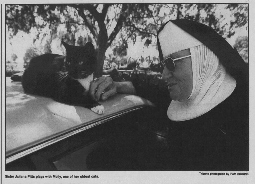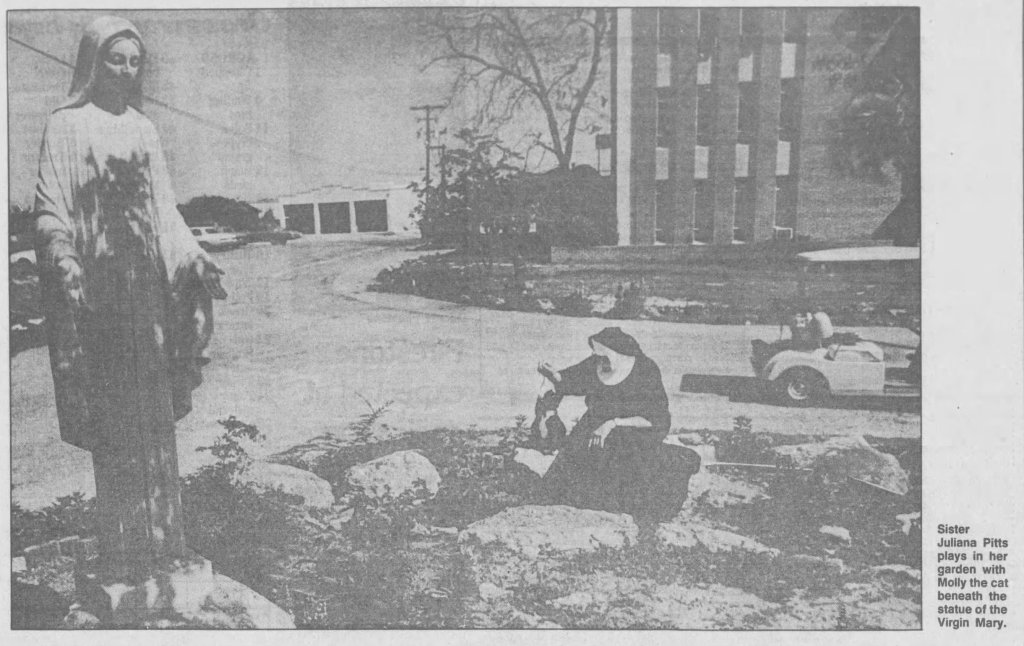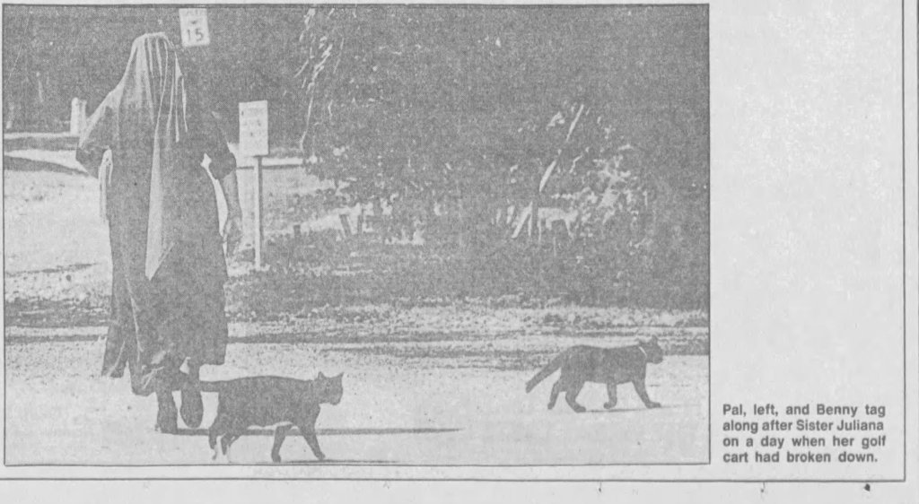 Sister Juliana was well known in the community for her love of taking in abandoned cats for over a decade. She cared for 30 or more cats at any one time. She once told a reporter in 1988, “God gave us life by breathing life into us, and if he breathed life into these animals, then they deserve the same respect that we do.”