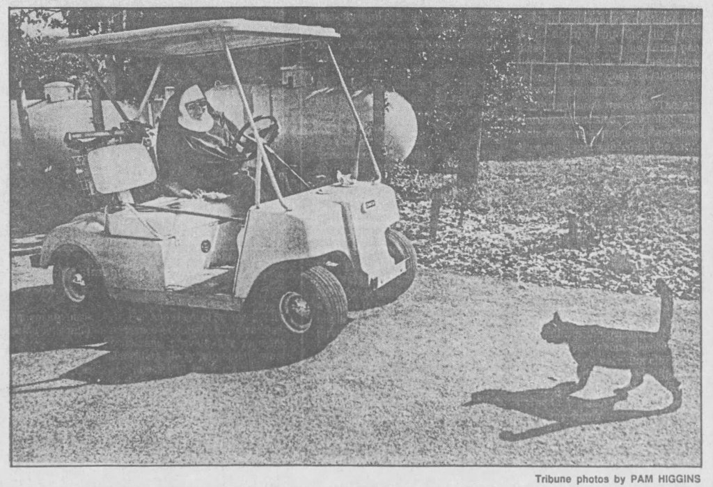 She zipped around the college grounds in her golf card, often with a cat or two along for the ride.