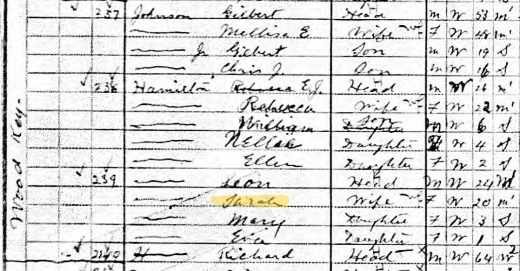 In 1910, Sarah lived on Wood Key in the Florida Everglades with her husband, Leon and daughter, Eva.