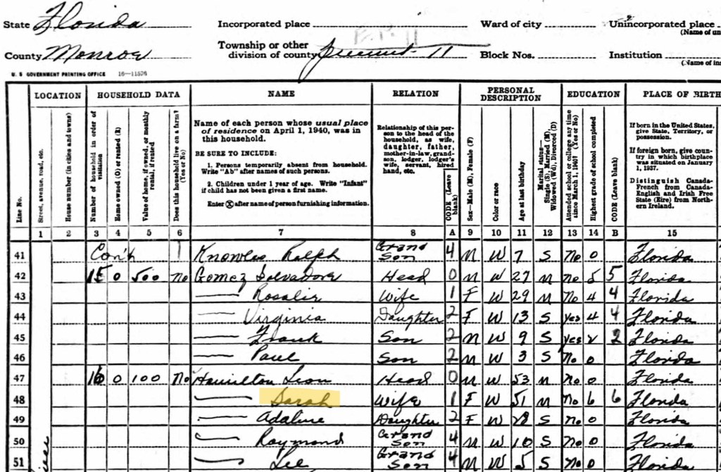1910 United States Federal Census; 1930 United States Federal Census; 1935 United States Federal Census;1940 United States Federal Census; 1950 United States Federal Census; Florida Death Index, 1877-1998; Lostmans Heritage: Pioneers in the Florida Everglades, Personal interview with Paul Gomes; U.S., Find A Grave Index, 1600s-Current; Family photos