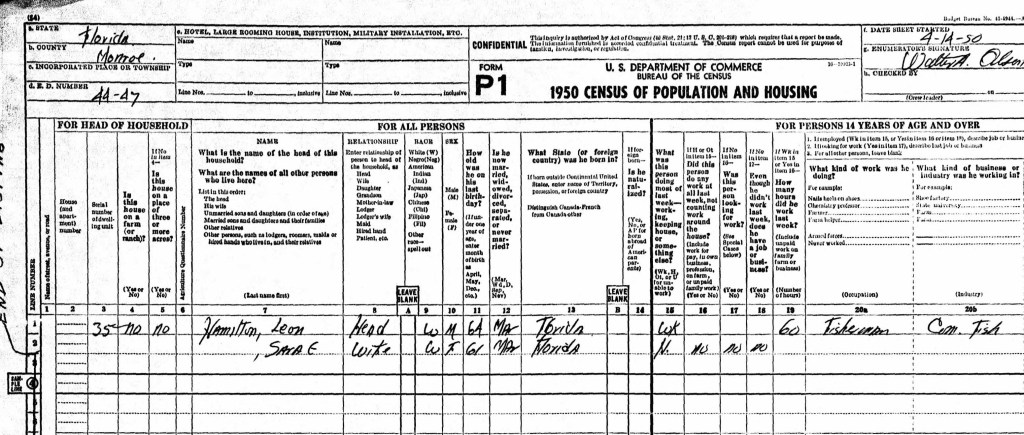 In 1950, the NPS (National Park Service) listed the people still living at Lostmans River and called them “squatters.” NPS officials stated that, “None of the fishermen who lived in houses or houseboats near the mouth of Lostmans River owned any property there.” Leon Hamilton, “℅ Riggs Fish Company in Everglades” was listed among hundreds of others on the Legal Notices page of the Key West Citizen calling for the condemnation of their homes.