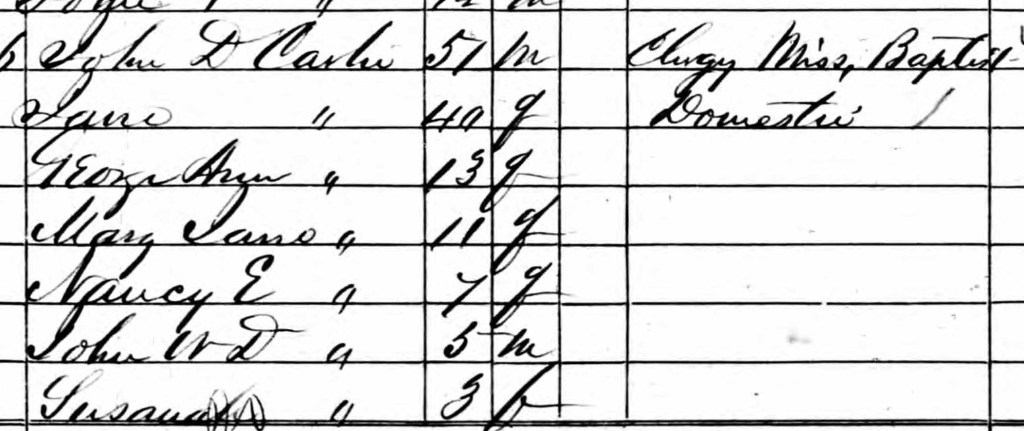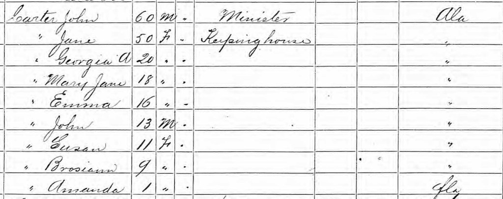 In 1860, Mary Jane (age 11) lived with her parents in Covington County, Alabama. Her father was a clergyman.