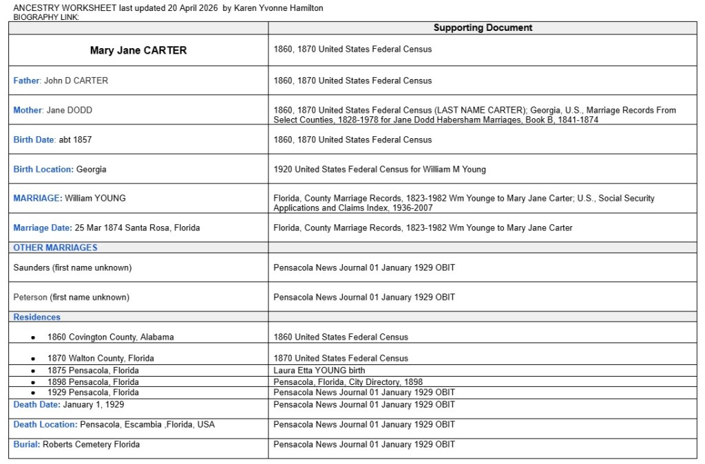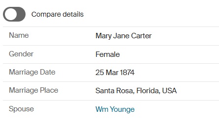 Mary Jane Carter married William Young in Santa Rosa, Florida, on March 25, 1874, when she was 15 years old. Wm Younge to Mary Jane Carter marriage document March 25 1874 Recorded May 2 1874 Frank Smith Clerk. I hereby certify that on the 25th day of march of 1874 I solemnized the rites of matrimony reference the above named parties JJ Cooper LLG