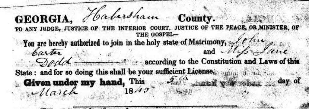 • John D Carter and Jane Dodd. (Two census records confirm father’s name. Mother’s maiden name confirmed with Georgia, U.S., Marriage Records From Select Counties, 1828-1978 Habersham Marriages, Book B, 1841-1874)