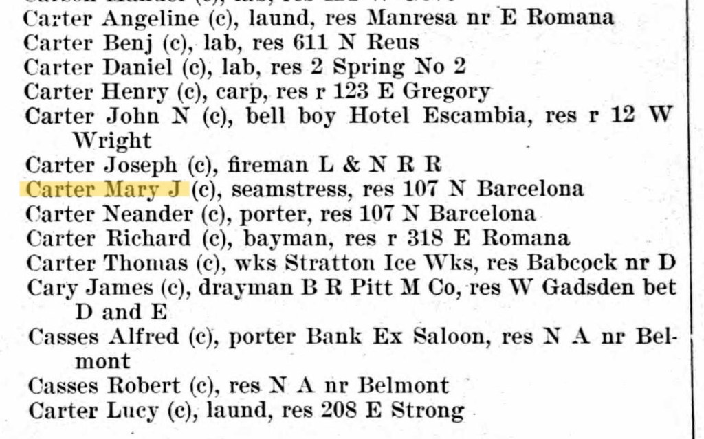 In 1898, Mary Jane Carter lived in Pensacola, Florida and worked as a seamstress.