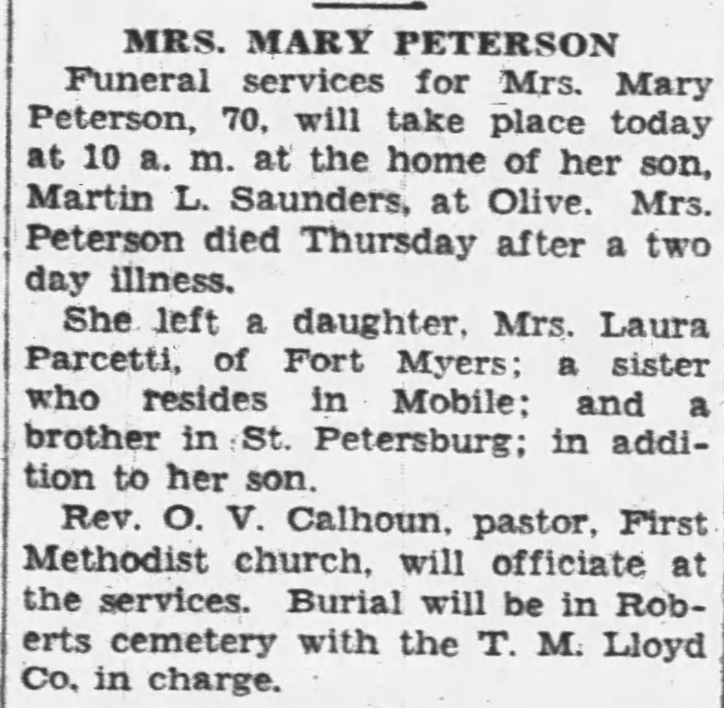 From her obituary in the Pensacola News, Mary Jane Carter married (first name unknown) PETERSON.